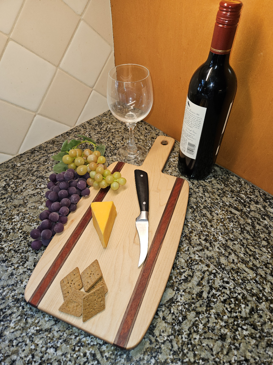 Our paddles are face grain boards also made with the 3 hardwoods: Walnut, Cherry, and Maple with accents of Purple Heart & Padauk woods in unique striped designs. They are handsome and handy!
